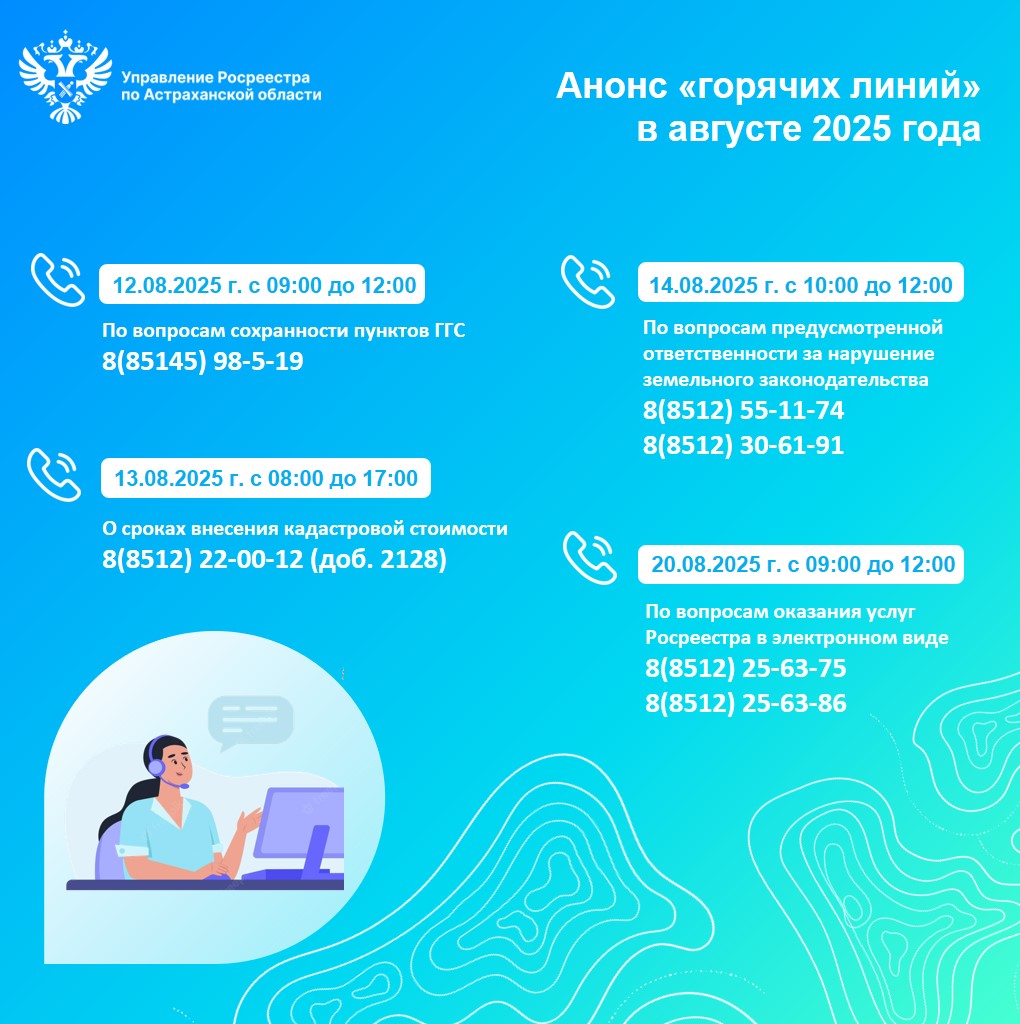 В августе 2025 года специалисты Управления Росреестра и филиала ППК «Роскадастр» по Астраханской области проведут телефонные «горячие линии», в рамках которых ответят на вопросы граждан в сфере земли и недвижимости:
