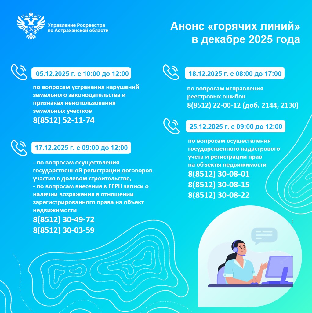 В декабре 2025 года специалисты Управления Росреестра и филиала публично-правовой компании «Роскадастр» по Астраханской области проведут телефонные «горячие линии», в рамках которых ответят на вопросы граждан в сфере земли и недвижимости: