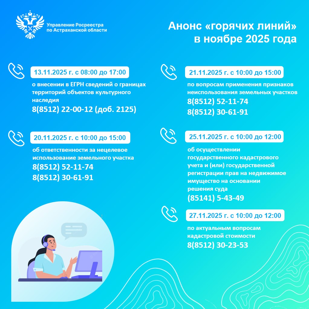 В ноябре 2025 года специалисты Управления Росреестра и филиала публично-правовой компании «Роскадастр» по Астраханской области проведут телефонные «горячие линии», в рамках которых ответят на вопросы граждан в сфере земли и недвижимости: