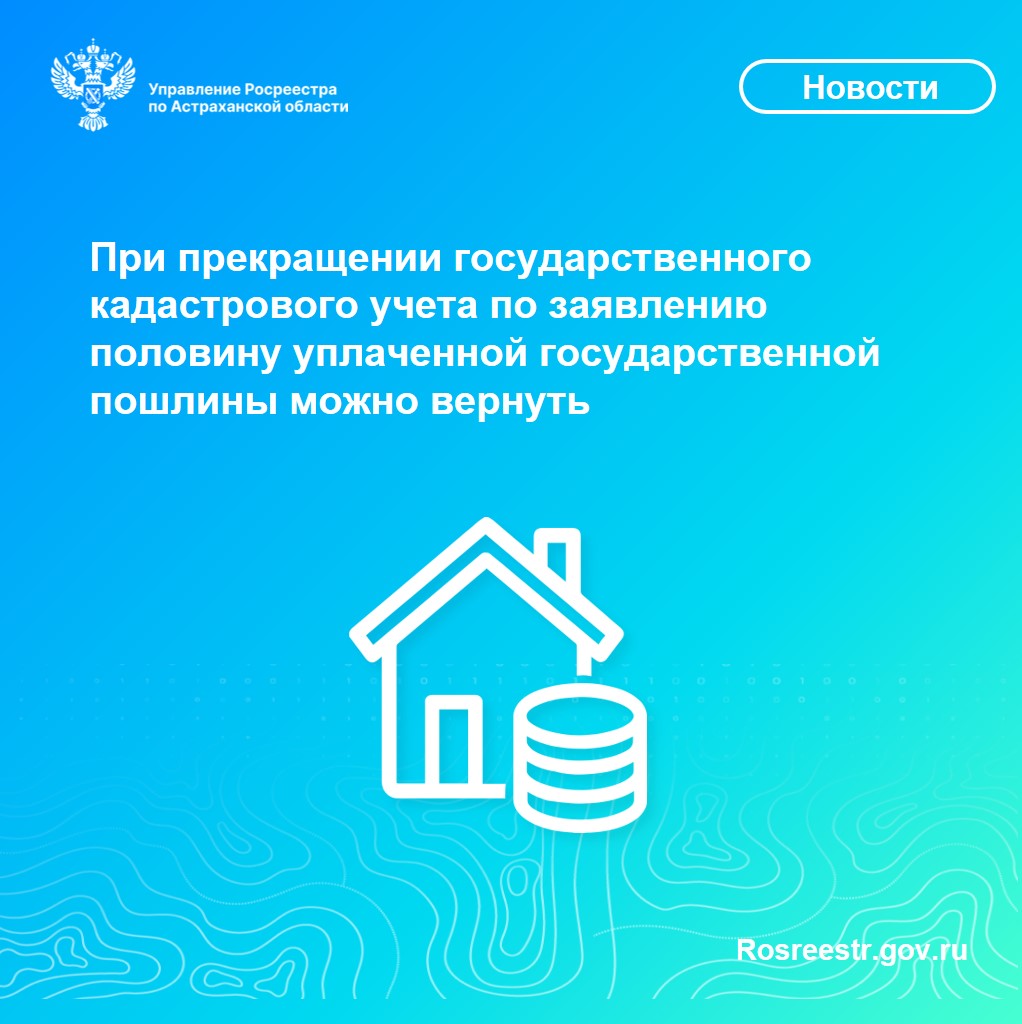 Управление Росреестра по Астраханской области информирует, что в связи с изменениями, внесенными в Налоговый кодекс Российской Федерации, половину уплаченной государственной пошлины за осуществление государственного кадастрового учета можно вернуть.