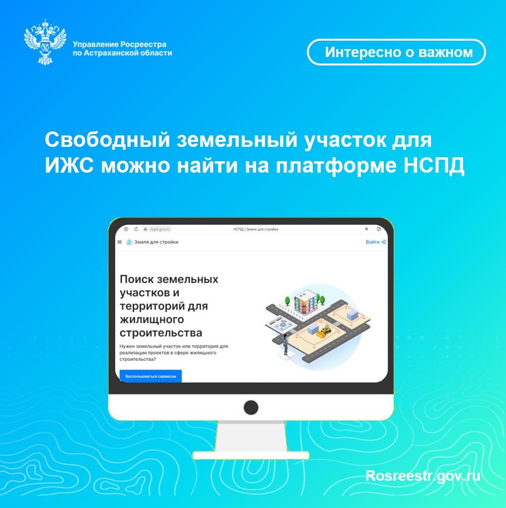 Управление Росреестра по Астраханской области напоминает, что выбрать свободный земельный участок под жилищное строительство можно самостоятельно с помощью сервиса «Земля для стройки», размещенного на федеральной государственной географической информационной системе «Единая цифровая платформа «Национальная система пространственных данных» (далее — НСПД).