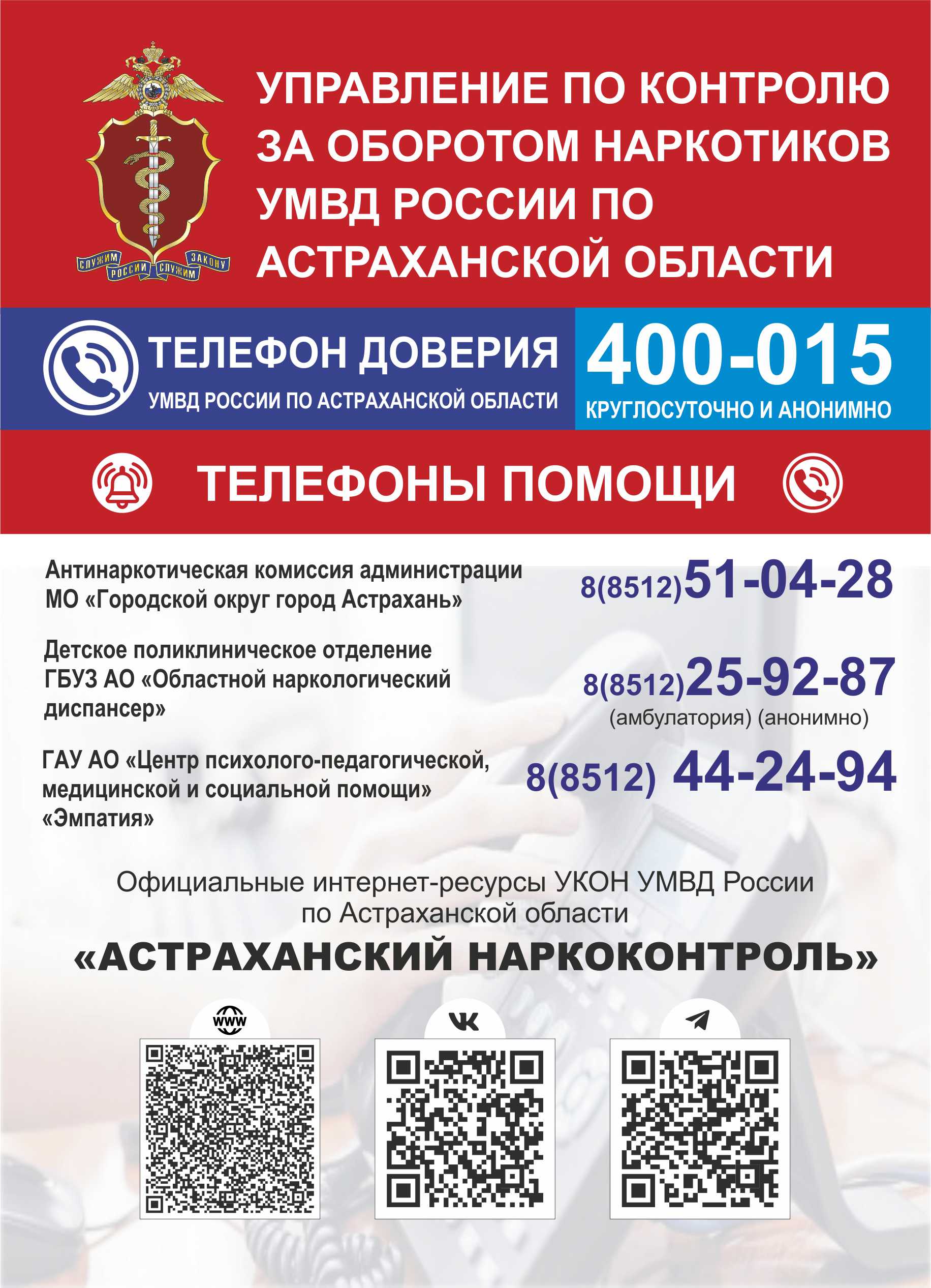 Позвонив по телефону выделенной линии Управления Министерства внутренних дел России по Астраханской области 8(8512)400-015, Вы можете Анонимно сообщить информацию о фактах незаконного употребления и незаконного оборота наркотиков, организации наркопритонов, вовлечения несовершеннолетних в наркопреступления.